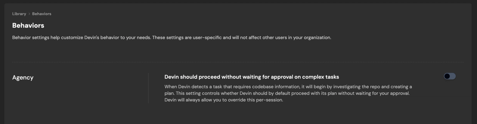 When Agency is turned off, Devin will wait for you to approve its plan before proceeding. Configure Behavior such as Agency in Settings.