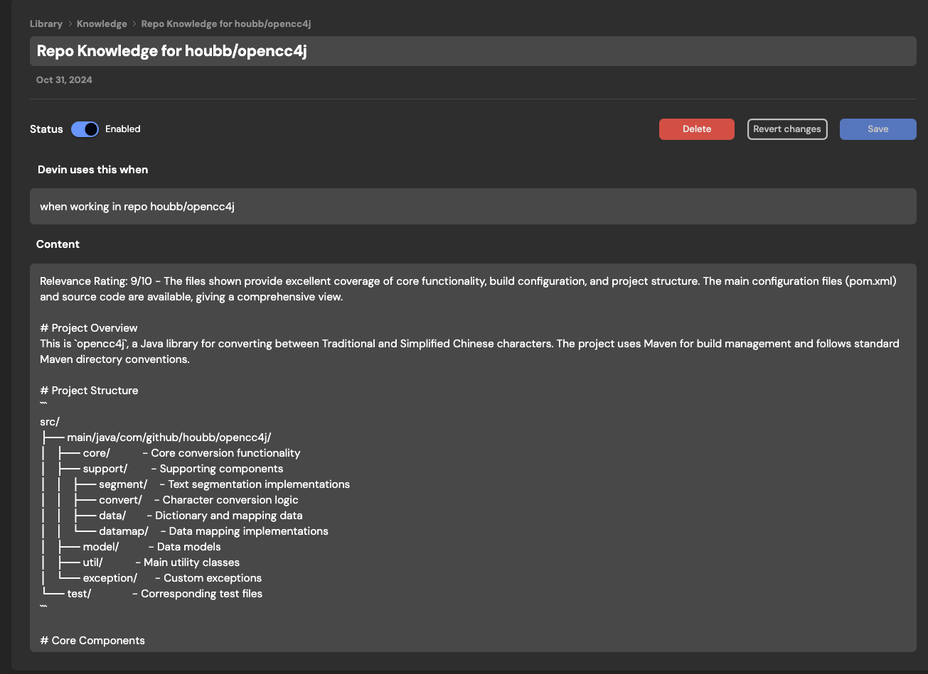 Devin will now automatically scan your repositories and generate Repo Knowledge. This allows Devin to more quickly and successfully do real work for you in your existing codebases. You can always add and edit your own Knowledge manually in Settings > Knowledge.