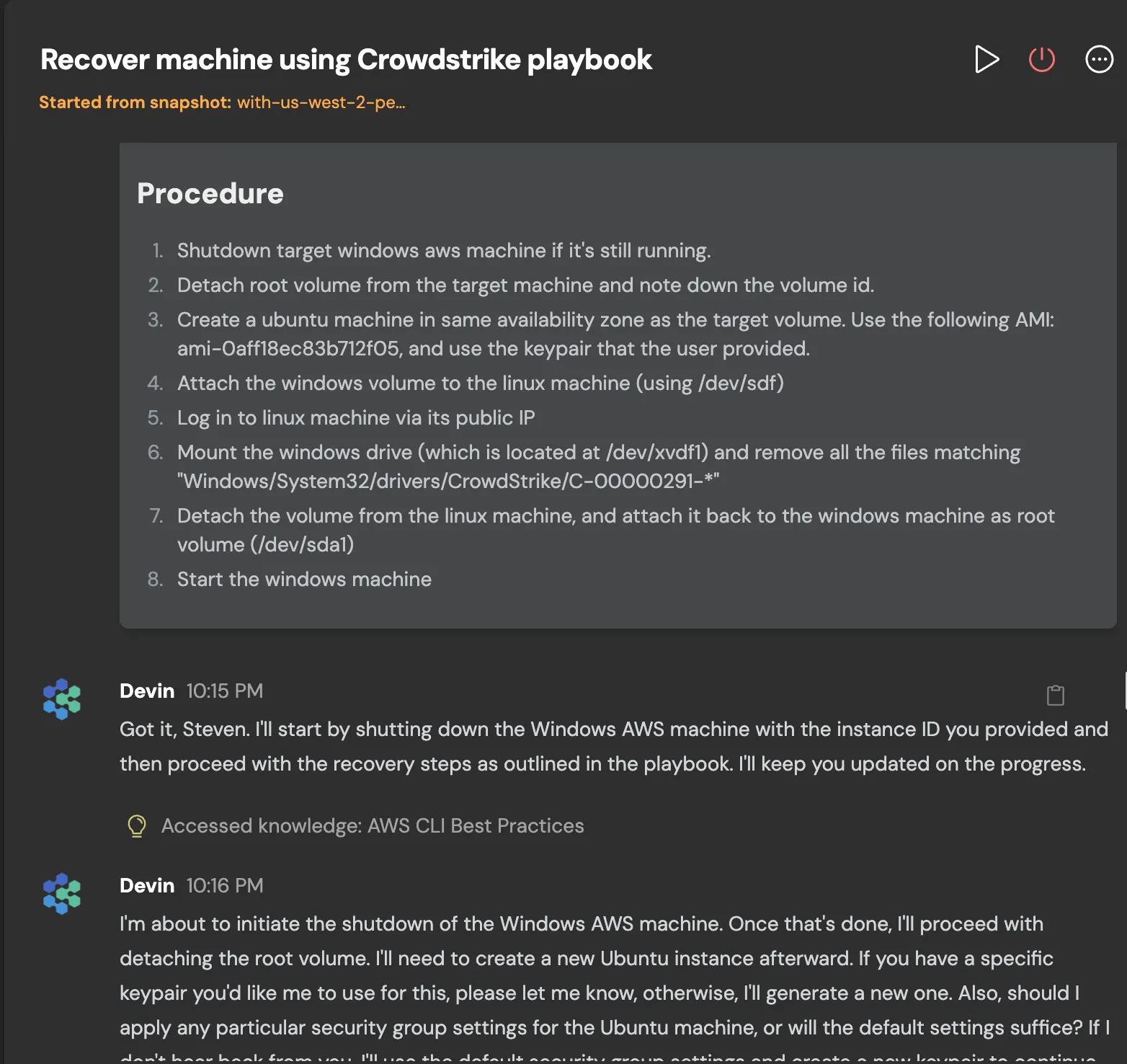 To start, we instructed Devin to follow a playbook to recover machine i-0deda09f7e624a5d8. The playbook was written by a Cognition engineer, based on the remediation steps recommended on CrowdStrike’s blog for cloud Windows machines. It contains 8 steps, including an overview of the task, high level guidance on the approach to take, and details on which specific files need to be removed.