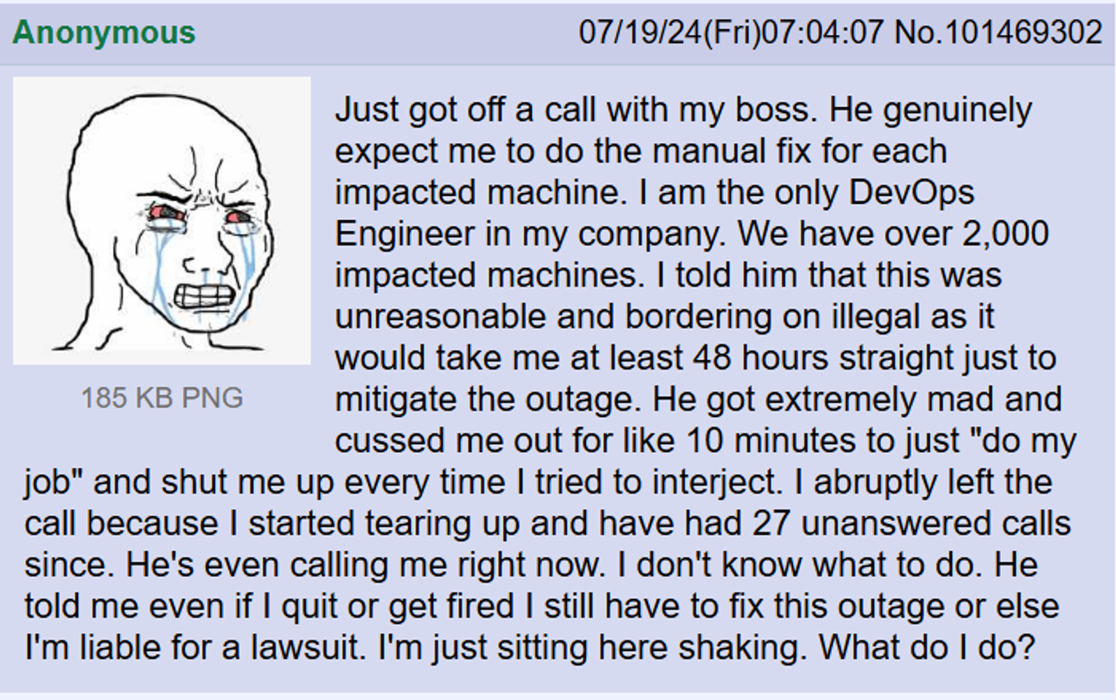 The CrowdStrike incident yesterday left Windows machines around the world stuck in the infamous Blue Screen of Death. Recovery efforts are ongoing but painful, and sometimes require manually fixing each machine:
