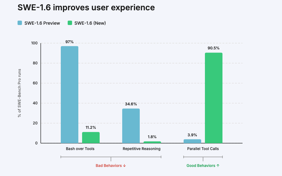 While SWE-1.6 achieves comparable performance to the Preview model on benchmarks like SWE-Bench Pro, we’re most excited about its dramatic improvement in what we call “model UX”. As we observed in our earlier post, the preview checkpoint exhibited several behavioral issues that added friction for our users. These included: