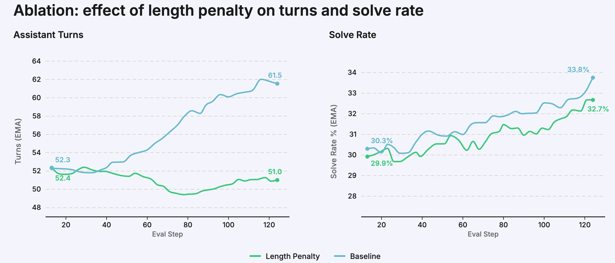 One contributing factor to this improvement was the introduction of a length penalty into training, which discourages unnecessarily long trajectories. This directly reduces overthinking and looping, while implicitly encouraging more efficient behaviors like parallel tool use. During training, we observed the model response length growing much more slowly than before while maintaining its intelligence and coding ability. The below ablation shows that task solve rate stays similar while assistant turns stays flat.