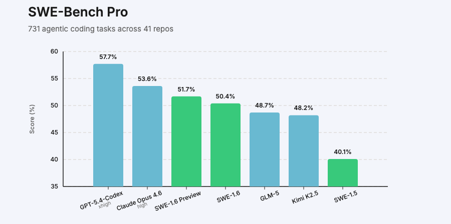 Last month, we released SWE-1.6 Preview, which improved on SWE-Bench Pro by more than 10% compared to our previous model SWE-1.5 while being post-trained on the same pre-trained model. SWE-1.6 was post-trained from scratch to jointly optimize for user experience and making the model feel smoother to use in addition to raw intelligence.