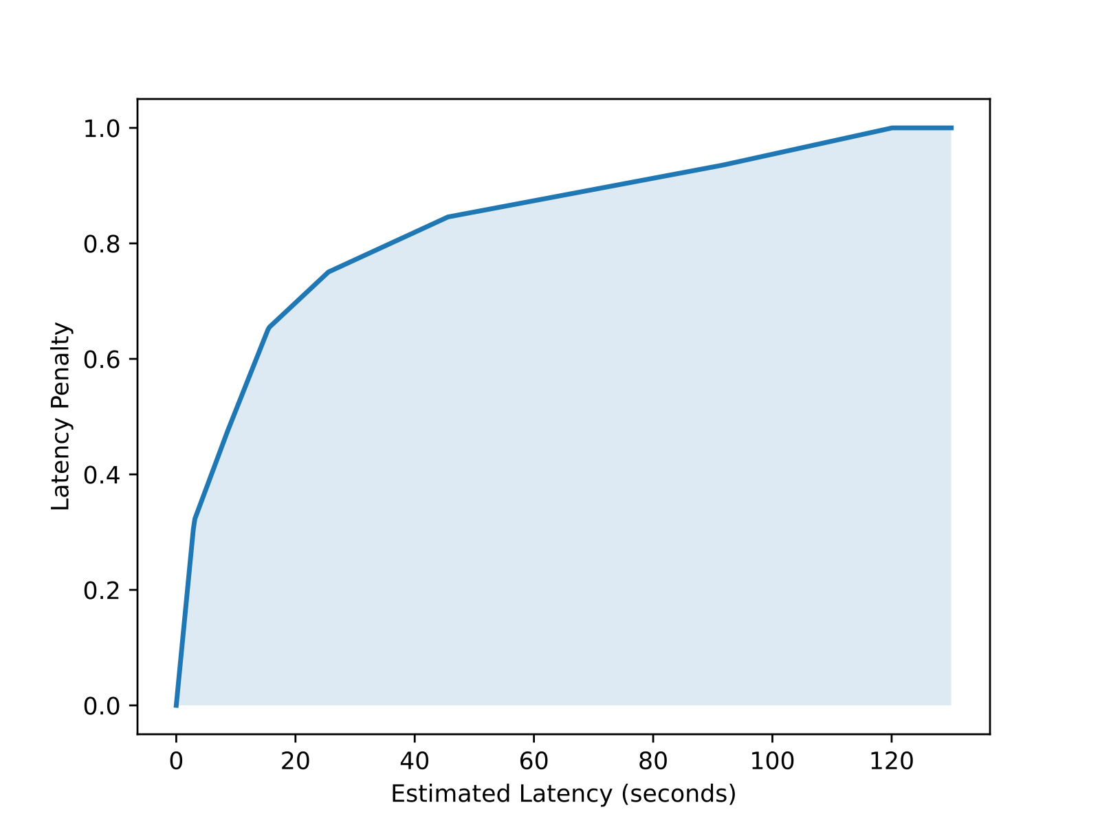 This distribution was effectively a proxy for how much time we had to keep users in-flow. We then computed the CDF of this distribution and used it to define a penalty that scales with estimated latency. The CDF at a given time tells us what fraction of users would have already moved on by then.