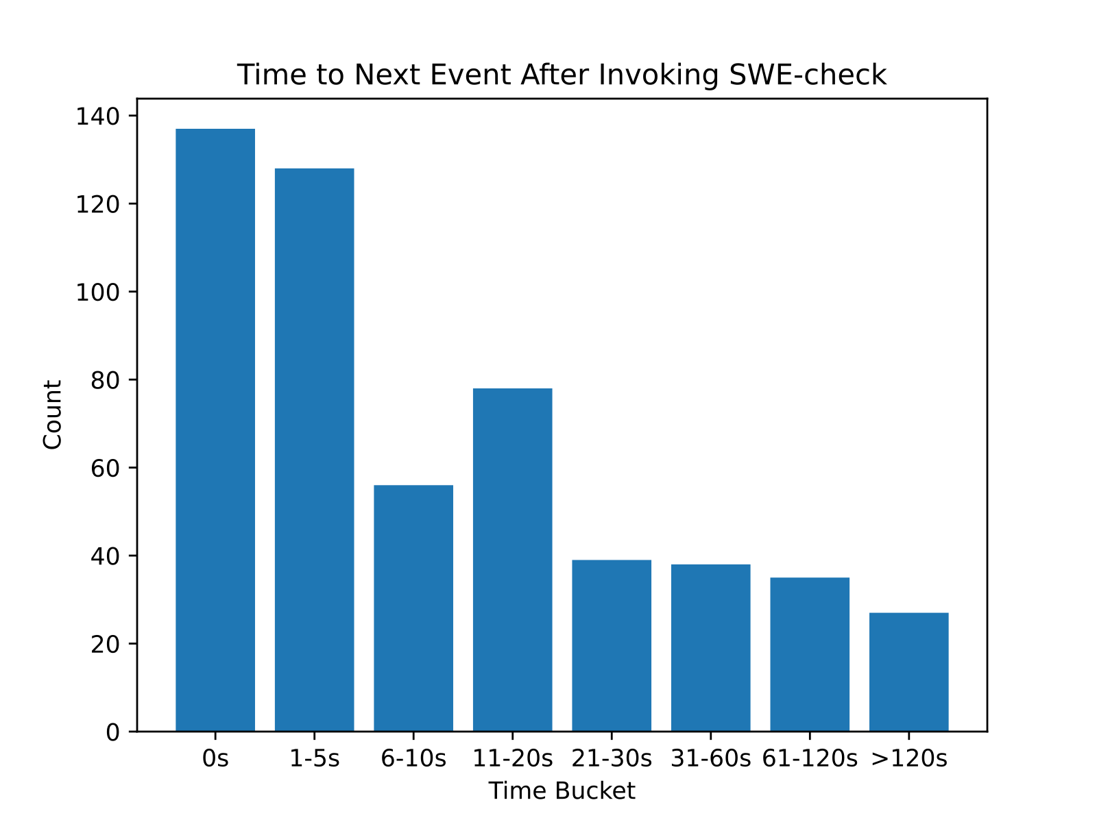 We also worked extensively on aligning the training reward with user behaviors during dogfooding trials of early versions of the SWE-check agent. For example, we looked at statistical data on how long it took for users to switch off of SWE-check after invoking it (more on this in the next section).