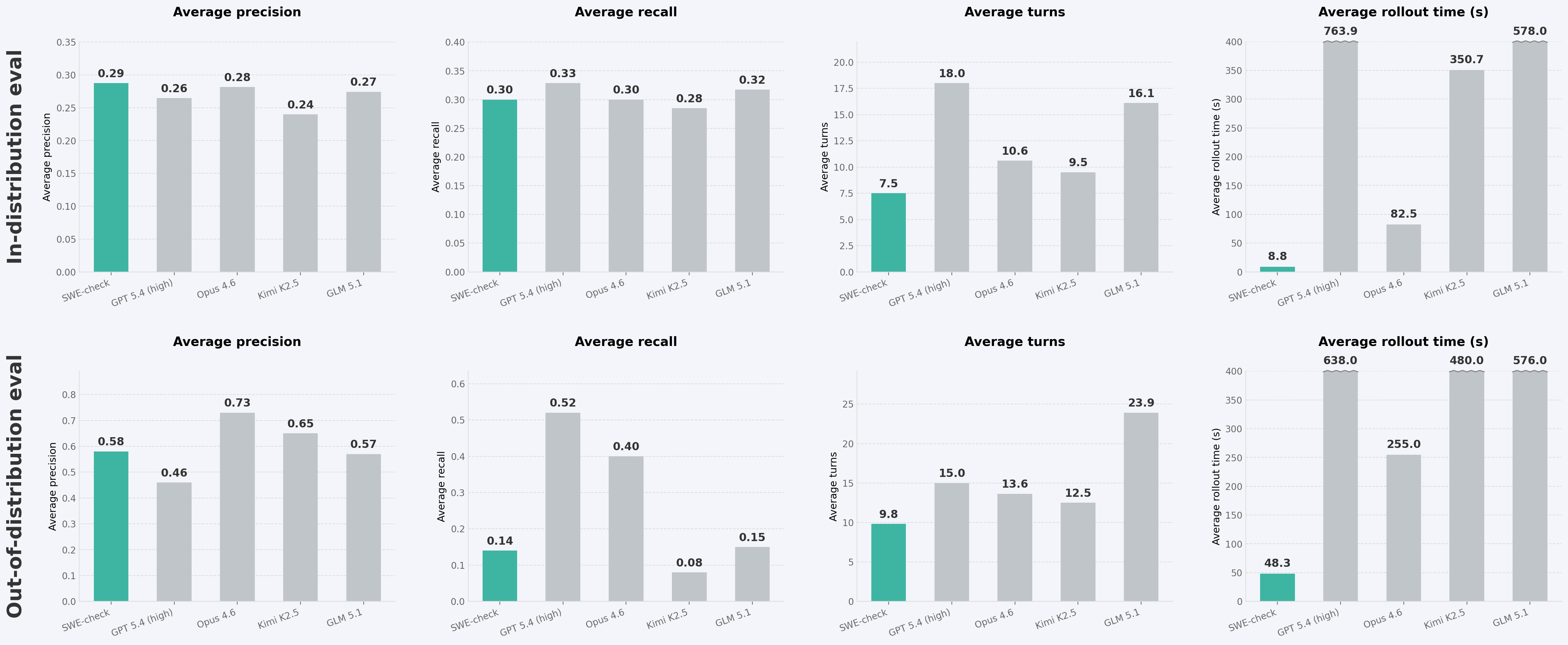 We've partnered with Applied Compute to put this to the test by collaborating to RL-train a bug detection model. The result is SWE-check, which matches frontier performance on internal in-distribution evals (delta F1 to Opus 4.6 goes from 0.09 to 0) and makes meaningful progress on out-of-distribution evals (delta F1 to Opus 4.6 goes from 0.49 to 0.29).
