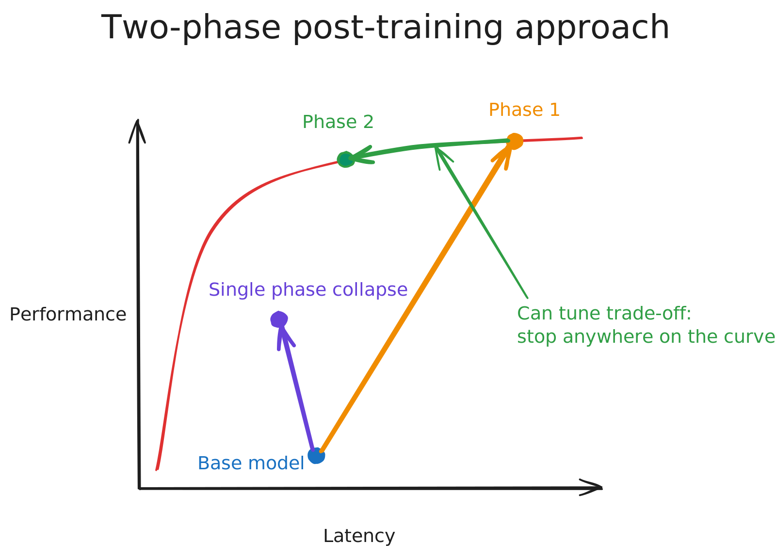 Our goal was to train a model with frontier performance that had a much better latency profile. We found that the most effective training approach split the process into two distinct phases. The two phases differ only in the reward function, with the rest of the training setup remaining exactly the same.
