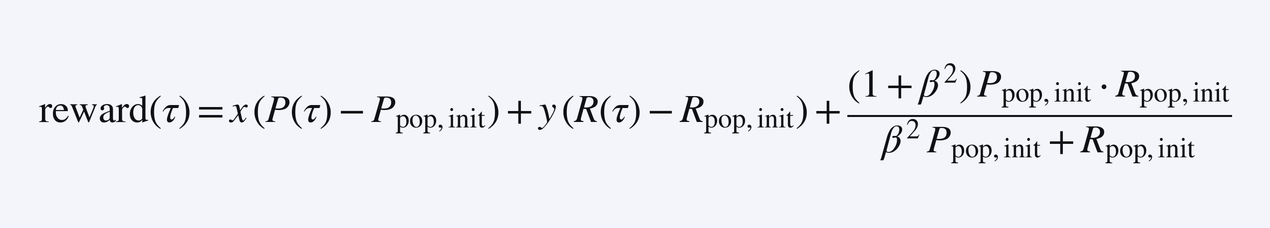 We define R_pop = E_τ[R(τ)] and P_pop = E_τ[P(τ)]. We ultimately want the model to increase the metric