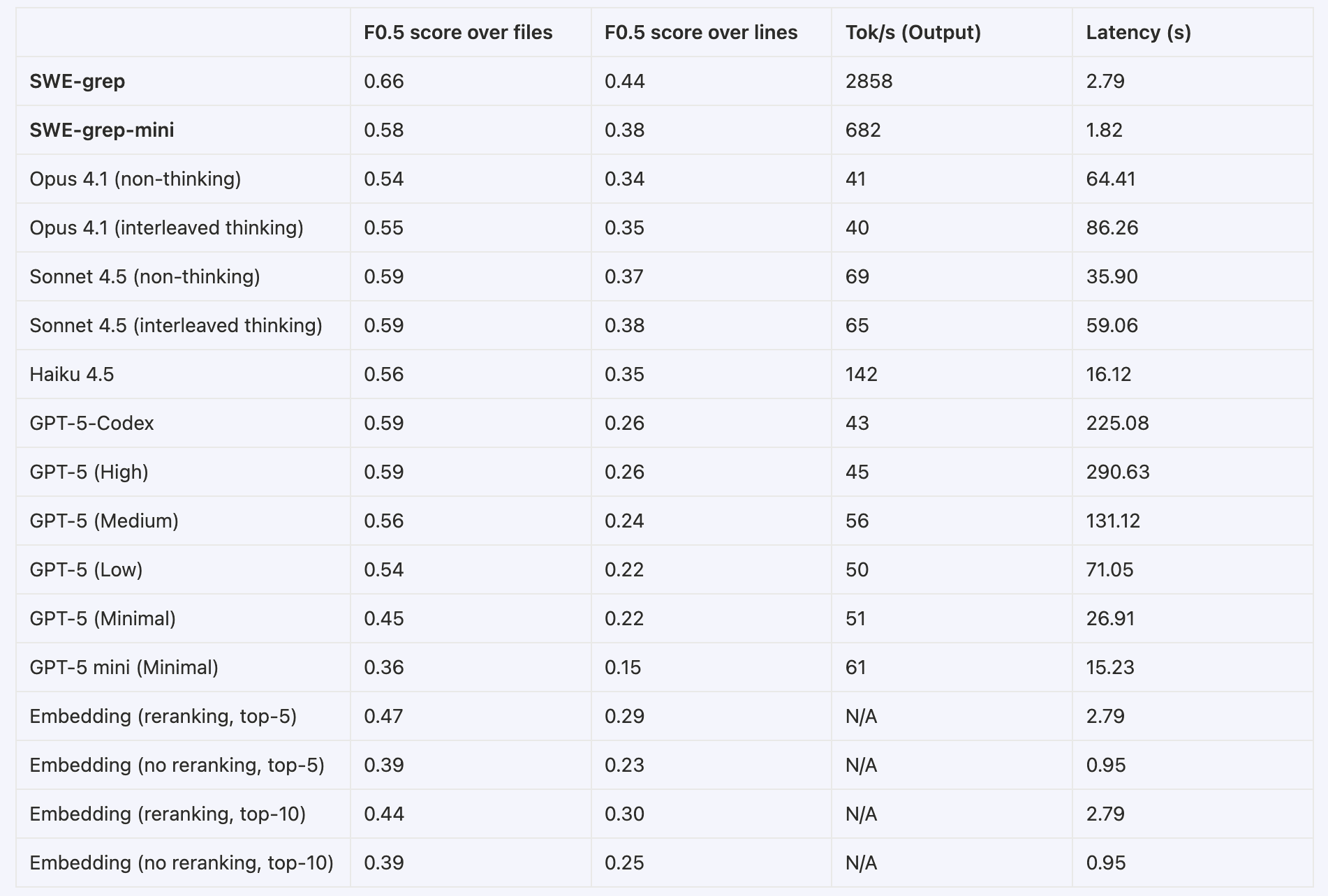 Our results on our evaluation set demonstrate that SWE-grep and SWE-grep-mini are an order of magnitude faster than frontier models, while matching or outperforming them at context retrieval.