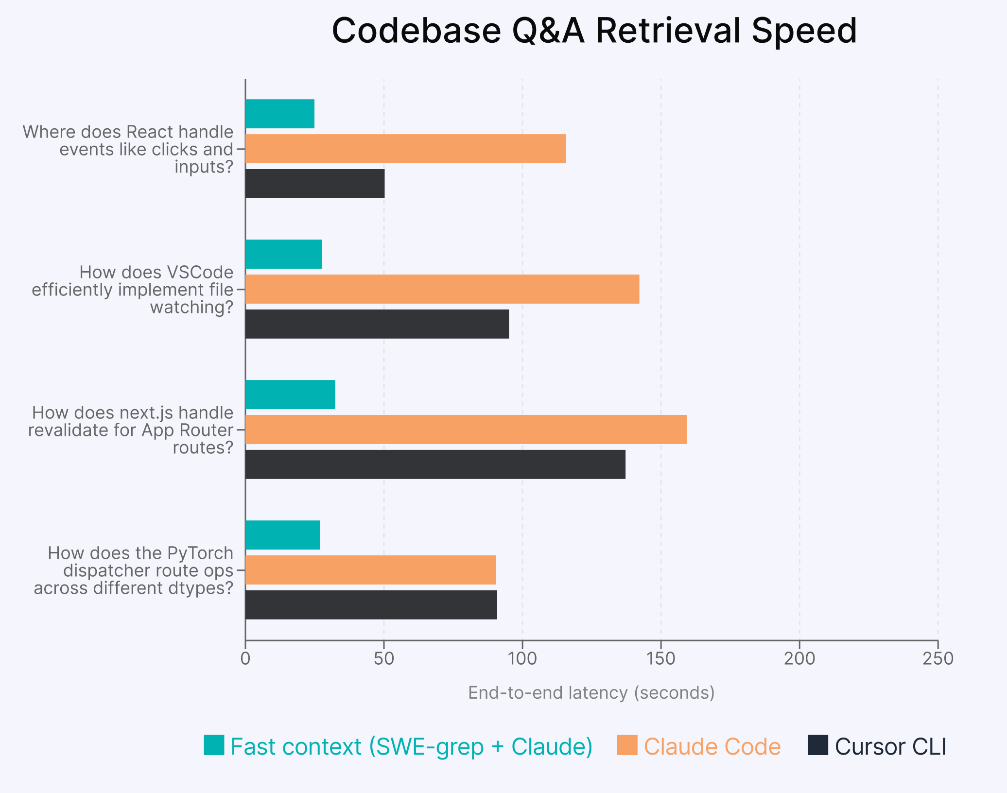 Codebase Q&A. We show the end-to-end latency on some example queries over open-source repositories. As with our playground setup, we benchmark the Fast Context agent—as it would be used in Windsurf—against Claude Code and Cursor CLI by measuring end-to-end latency.