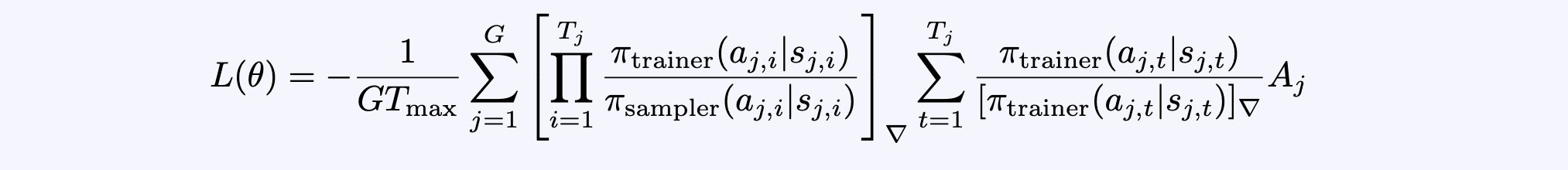 where we sample g completions from the same prompt for the Monte Carlo estimate, Aⱼ = Rⱼ - mean(R₁, ... ,R₉) and T_max is the maximum number of sampled tokens allowed during training (like Dr. GRPO).