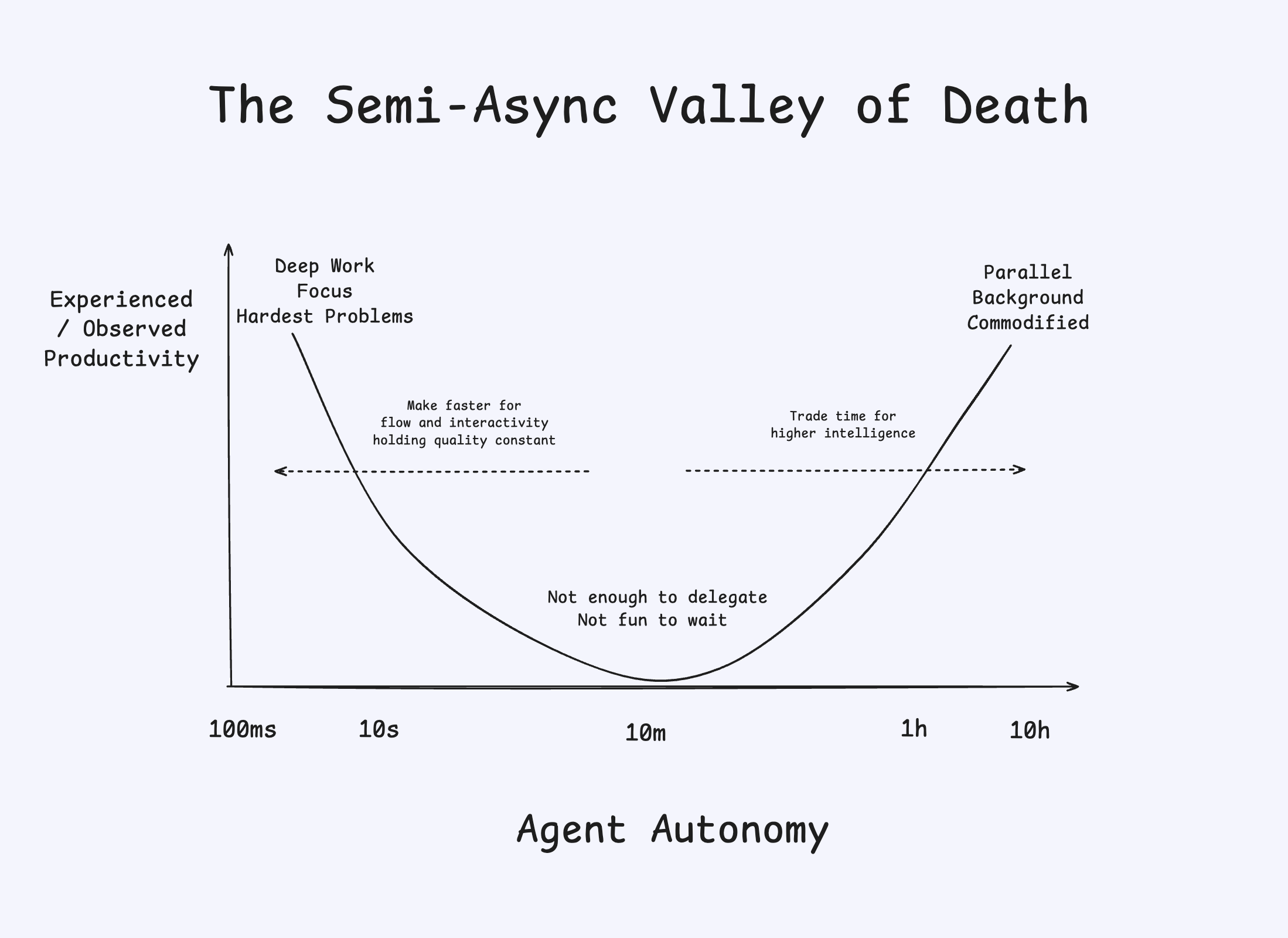 Our ultimate goal at the combined Cognition+Windsurf is to maximize your software engineering productivity, and we are simultaneously researching both the directions of pushing the frontier of coding agent autonomy -AND- making them faster given a “good enough” bar. The best mental model we’ve found is the one we’ve arrived at below - avoid the Semi-Async Valley of Death at all costs!