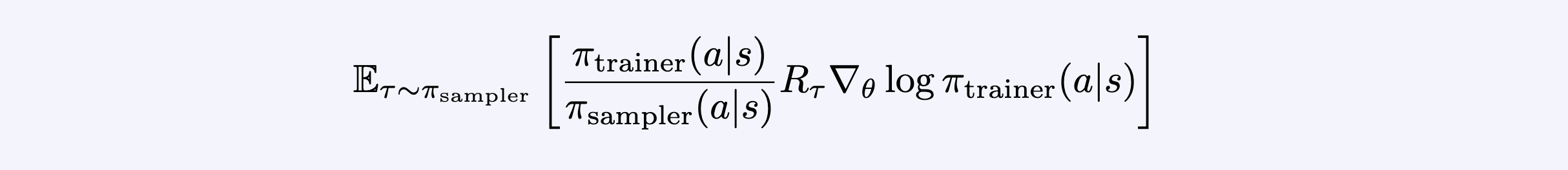 where the sum is over the tokens in a single trajectory. If we are able to sample from the training policy, we can use a simple Monte Carlo estimate for the gradient, which is unbiased when the data is on-policy. However, standard training and inference libraries have different numerics, which effectively turns the sampled data into off-policy data. This is amplified when using low-precision rollouts, a common optimization in RL frameworks. The solution is to apply importance sampling. Recent works have proposed using per-token importance sampling ratios. Per-token ratios, though, do not fully remove the bias. Indeed, at step t we have an action-choice mismatch, a state-distribution mismatch, and a reward-signal mismatch. A per-token ratio corrects only the action-choice mismatch. To derive an unbiased estimate, we apply per-sequence importance sampling