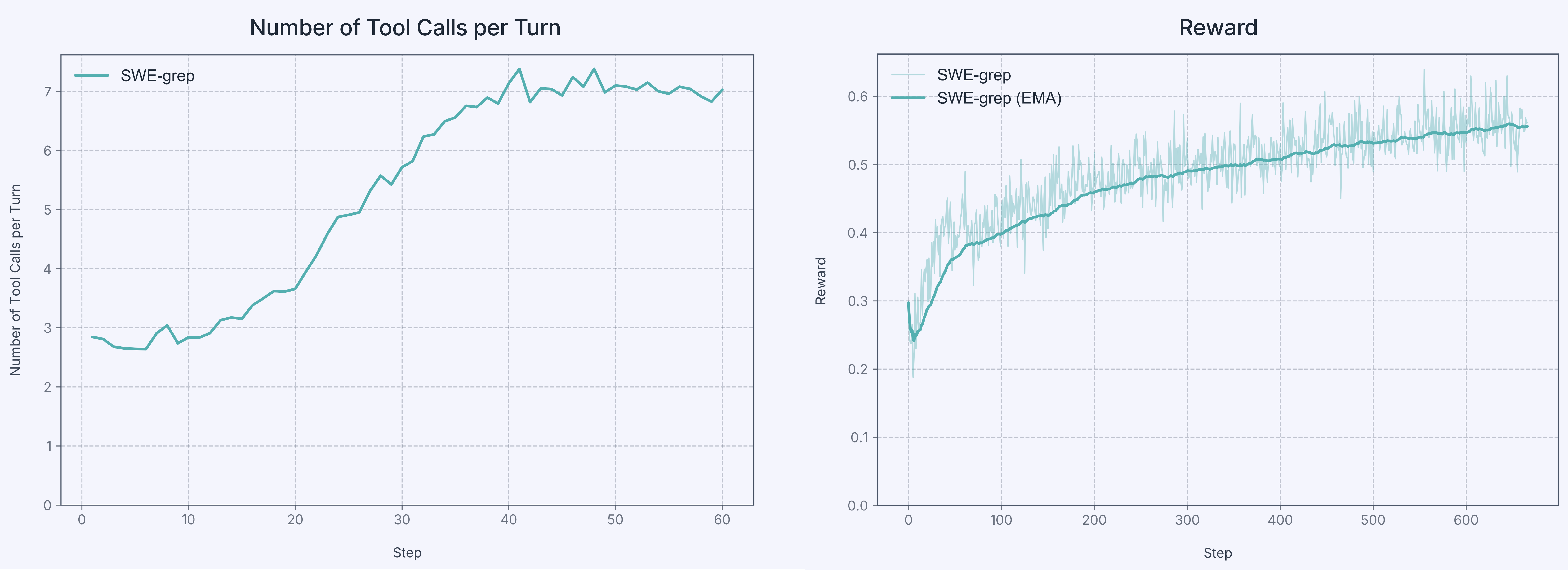 and perform additional reinforcement learning to boost the model’s performance on the task. Our reward function is an average of weighted F1 scores over file retrieval and line retrieval tasks, with respect to our ground truth dataset. This objective was sufficient for SWE-grep