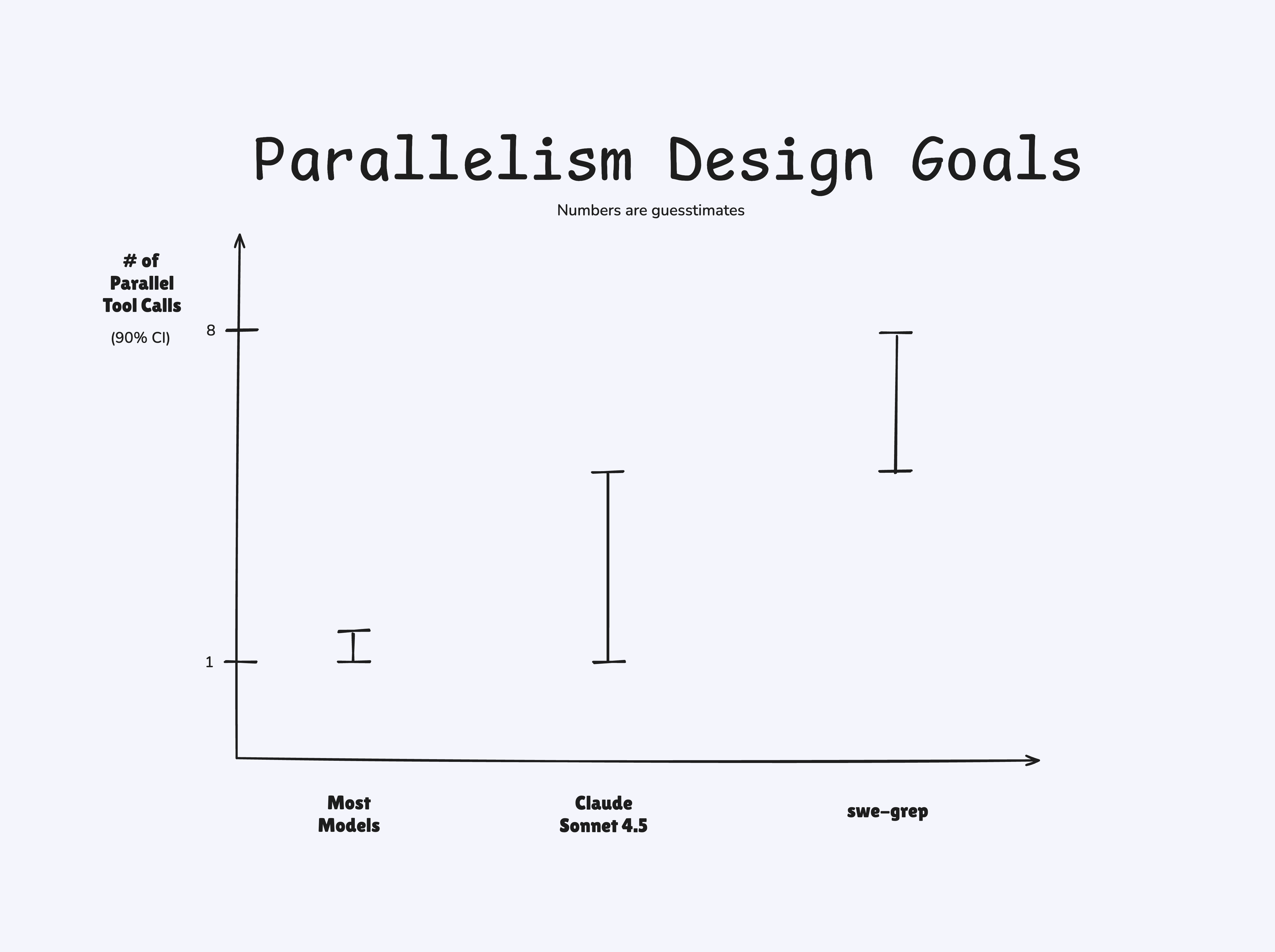 While many models technically support parallel tool calls, it’s difficult to get them to use them effectively. Models are getting better than this—Sonnet in particular has improved greatly from 3.6 to 4.5—but we felt that models didn’t exploit them optimally. Here is a rough sketch of the model design space that we targeted for SWE-grep