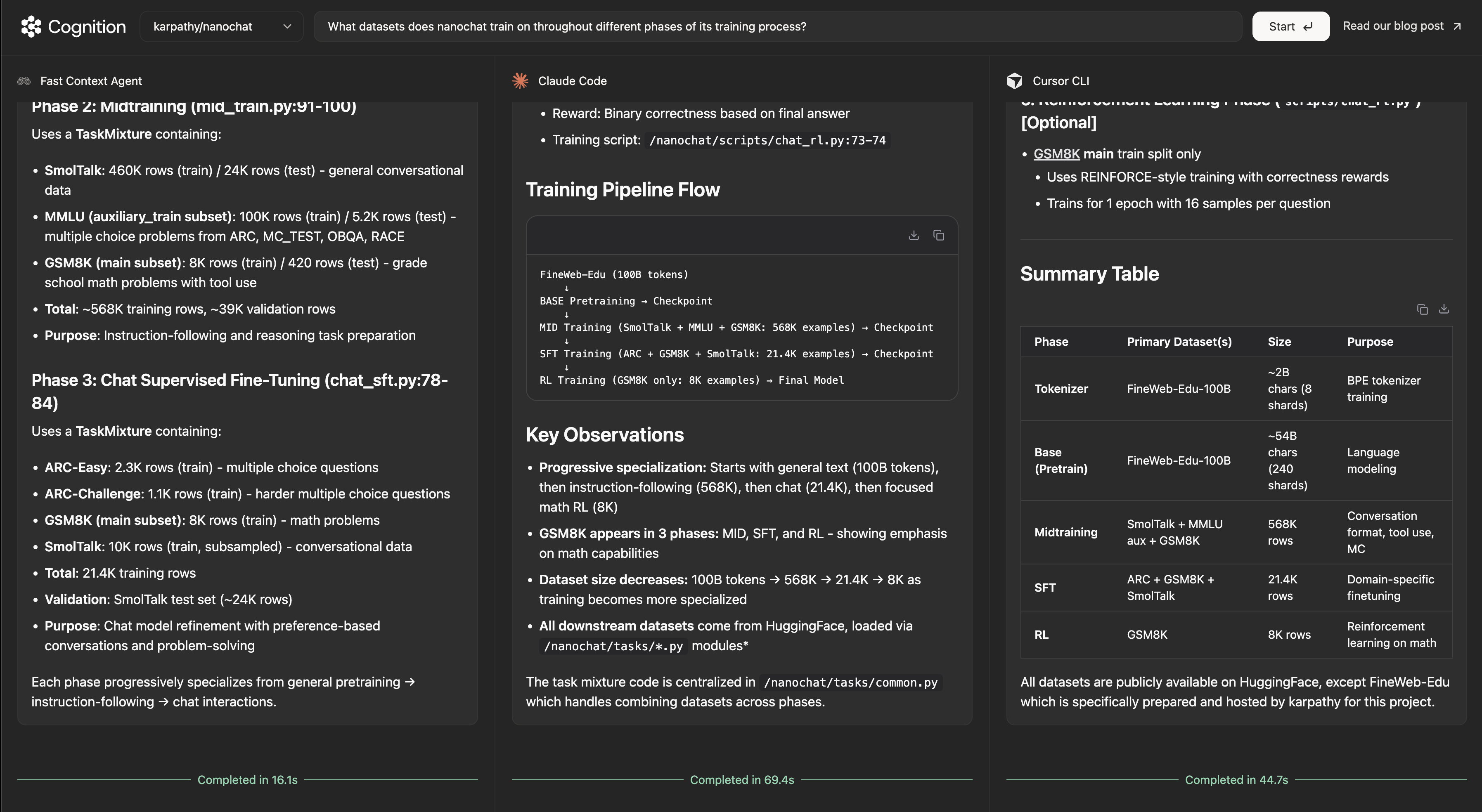 Since we are offering direct comparisons between our agent and alternative agents, we should mention what is going on here and our attempts to make it a fair comparison. We host all 3 agents - a Fast Context Agent stripped out of Windsurf, stock Claude Code, and stock Cursor CLI - in their own Modal containers and pipe the inputs/outputs through stdin/stdout. This is meant to reflect the experience of using each agent locally. This is not meant to be an extremely rigorous benchmark, just a demo experience we cooked up on the side to answer the obvious question of “how does Fast Context compare to what I’m used to outside of Windsurf?” You should run these tests in your own environment (with Fast Context in Windsurf) for best fidelity to your actual experience.